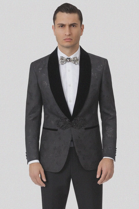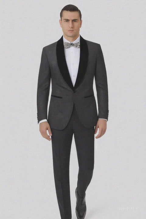 This elegant tuxedo is cut in a slim, modern silhouette and crafted from a shiny black paisley fabric that gives a subtle, luxurious texture. The shawl lapel and “smoking” jacket styling bring a European-inspired edge to a classic black tux, making it perfect for men who want to stand out without going over the top.