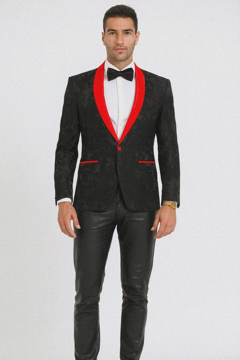 Black and Red Tuxedo Jacket Floral Pattern Slim Fit - Wedding - Prom