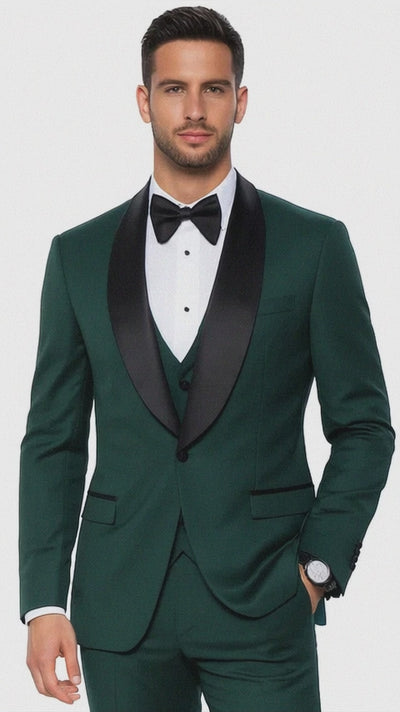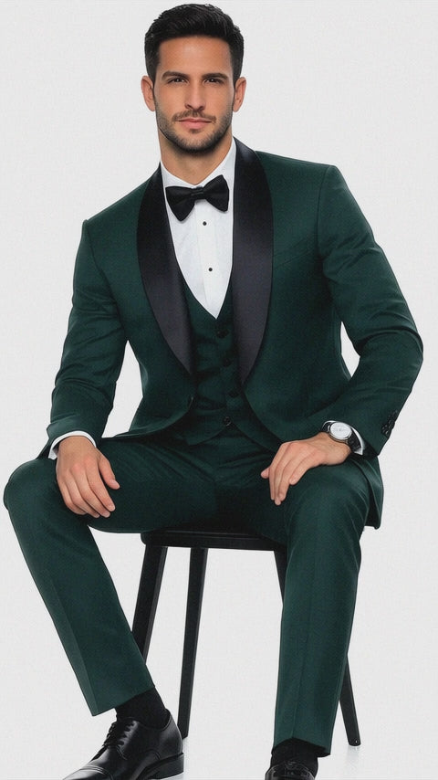 Make a bold and elegant statement with this Green Slim Fit Tuxedo with Large Black Shawl Lapel, a refined 3-piece set designed for weddings, proms, and formal celebrations. Tailored for a modern slim-fit silhouette, this tuxedo features a rich green jacket accented by a striking black satin shawl lapel for a sophisticated contrast. The coordinated vest and matching trousers complete a polished, head-to-toe look ideal for grooms, groomsmen, and fashion-forward formalwear. Crafted from premium fabric with expert tailoring, this tuxedo offers both comfort and confidence throughout your special event. Perfect for evening weddings, black-tie occasions, holiday parties, and upscale receptions, it delivers timeless elegance with a contemporary edge. Stand out with a distinctive tuxedo that blends classic craftsmanship, modern styling, and bold color for unforgettable formal moments.