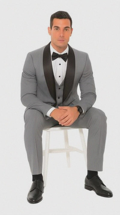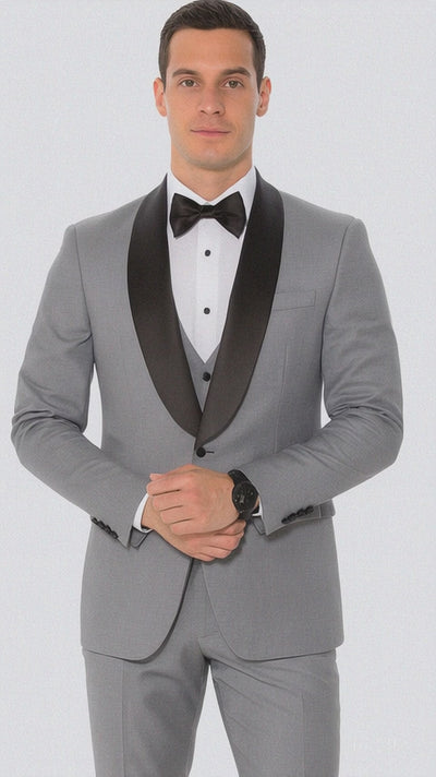 Grey Slim Fit Tuxedo with Large Black Shawl Lapel – 3 Piece Wedding & Prom Set
