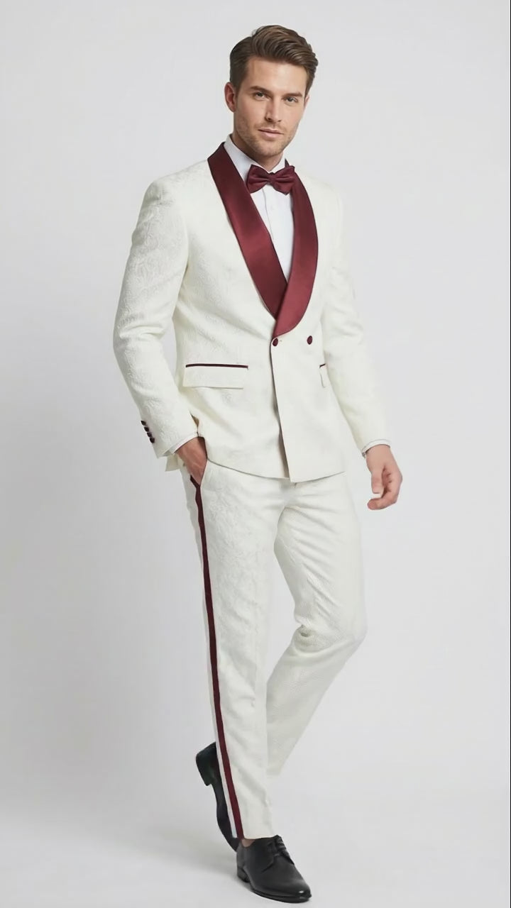 Step into timeless elegance with this men’s ivory and burgundy jacquard tuxedo suit, designed for upscale events where sophistication is essential. Made from premium jacquard fabric, this tuxedo showcases a refined textured pattern that adds depth and luxury to the ensemble. The clean ivory base paired with a rich burgundy satin shawl lapel creates a bold and distinguished contrast, perfect for weddings, proms, formal dinners, and gala celebrations.