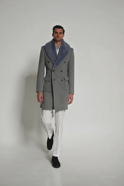 Men’s Light Grey Double Breasted Overcoat with Faux Fur Shawl Collar – Winter Luxury Coat Wool Fabric