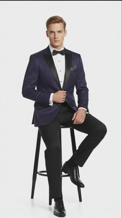 Men’s Purple Paisley Tuxedo Jacket – Ultra Slim Fit Dinner Blazer with Black Satin Peak Lapel