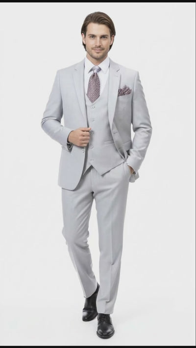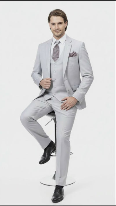 The light gray color provides a clean and versatile aesthetic, suitable for weddings, business meetings, celebrations, and upscale events. The jacket features a notch lapel, flap pockets, and structured tailoring that creates a sharp silhouette. The coordinating vest adds a sophisticated layered touch, while the tailored pants complete the ensemble with a sleek and professional finish.