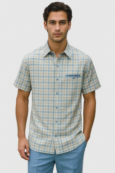 Refresh your wardrobe with the refined elegance of the Mens Plaid Walking Suit in powder blue by Dreams by Zacchi. This stylish 2-piece leisure outfit features a perfectly coordinated plaid dress shirt and matching pants in a soft, eye-catching powder blue color. Perfect for spring and summer occasions, church services, casual gatherings, or weekend outings, this walking suit blends classic sophistication with modern charm.