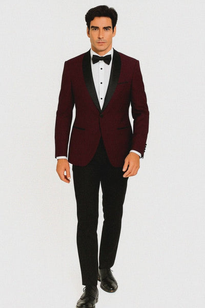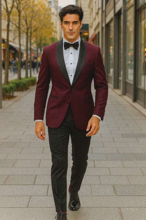 Prom Tuxedo - Wedding Suit - Groom Suit MEN'S BURGUNDY WITH BLACK LAPEL VESTED 100% WOOL TUXEDO