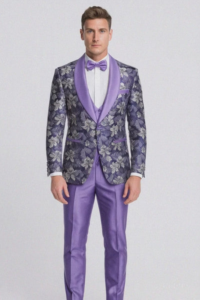 This striking lavender floral tuxedo suit is a perfect blend of artistic design and modern luxury. Crafted from premium patterned fabric, the jacket features an elegant floral motif in soft lavender and silver tones, creating a refined yet eye-catching appearance. The smooth satin shawl lapel adds a polished contrast, enhancing the formal silhouette. Paired with matching lavender trousers and a coordinating bow tie, this suit delivers a cohesive and fashion-forward ensemble. Tailored with a slim, structured fit, it sharpens the shoulders and contours the body for a confident and stylish profile. Fine stitching, smooth lining, and quality detailing reflect exceptional craftsmanship. Designed for men who appreciate bold elegance, this tuxedo suit offers comfort, sophistication, and standout style, making it ideal for unforgettable formal occasions.