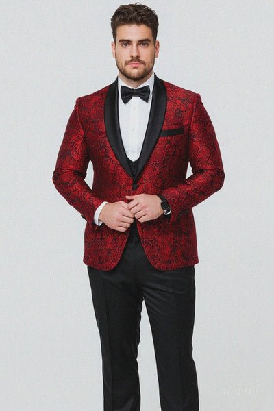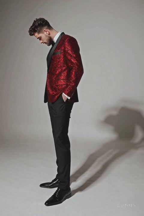 This striking red-and-black floral tuxedo suit is designed for men who want to make an unforgettable entrance at any formal event. The jacket showcases an intricate jacquard rose pattern that creates a bold, luxurious texture, while the sleek black satin shawl lapel adds contrast and refinement. The tailored fit enhances the wearer’s shape, offering structure, elegance, and comfort throughout the occasion. Paired with black formal trousers, this suit achieves a powerful modern look that blends classic sophistication with contemporary flair. The vibrant red color makes it perfect for evening celebrations where style and confidence matter. Crafted from premium-quality fabric, this tuxedo maintains durability and breathability while elevating your wardrobe with standout charm. Ideal for weddings, proms, galas, and upscale parties, this ensemble ensures that you remain the center of attention with its flawless design and commanding presence.