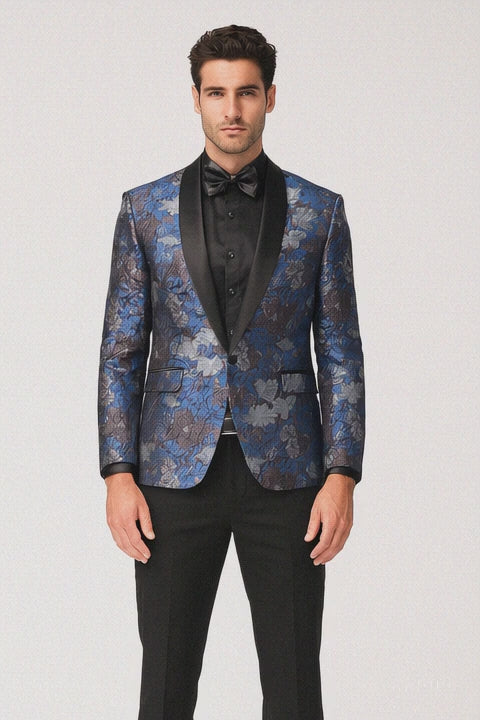 This striking blue metallic floral tuxedo jacket is designed for men who want to stand out with confidence and refined elegance. Crafted from premium jacquard fabric, it features an intricate floral pattern highlighted with subtle metallic tones that catch the light beautifully. The black satin shawl lapel adds classic sophistication, balancing the bold design with timeless formal structure. Tailored for a modern slim fit, the jacket enhances the shoulders and contours the body for a sharp, polished silhouette. Finished with smooth inner lining, satin-trimmed pockets, and precise stitching, it offers both luxury and comfort. Ideal for evening wear, this tuxedo jacket blends artistic detail with formal refinement, making it a standout piece for men who appreciate bold fashion with a high-end finish.