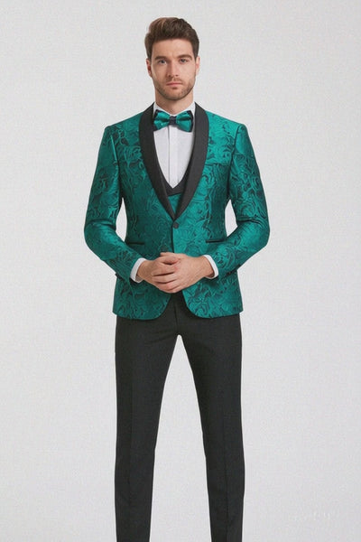 This luxurious teal floral tuxedo jacket is designed for men who want to combine bold style with refined elegance. Crafted from premium jacquard fabric, it features an intricate floral pattern woven into a rich teal base that adds depth, texture, and visual impact. The contrasting black satin shawl lapel enhances the formal structure, creating a striking balance between classic tuxedo tradition and modern fashion. Tailored for a sharp, slim fit, the jacket defines the shoulders and contours the body for a confident, polished silhouette. Finished with satin-trimmed pockets, smooth lining, and precise stitching, it offers both comfort and durability. Paired with a matching bow tie, this jacket is ideal for standout evening wear. Perfect for men who appreciate statement fashion, it delivers sophistication, confidence, and unforgettable style at any upscale event.
