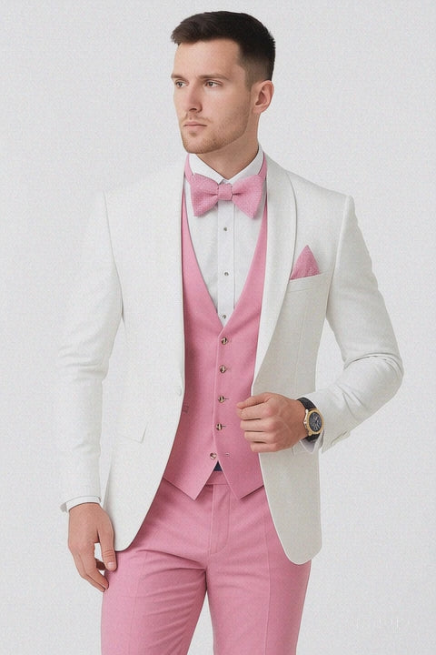 White and Light Pink Tuxedo Wedding Suit - White Dinner Jacket + Vest + Pants + Bow-tie