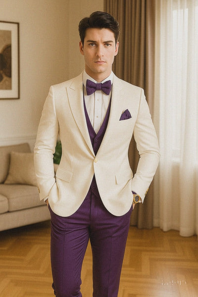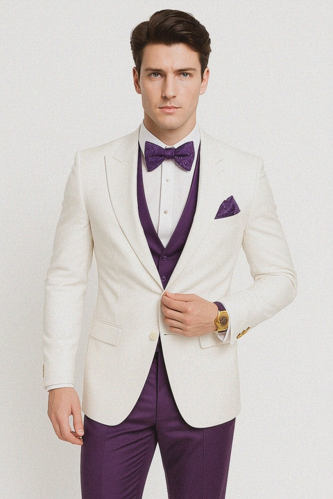White and Purple Tuxedo Wedding Suit - White Dinner Jacket + Vest + Pants + Bow-tie