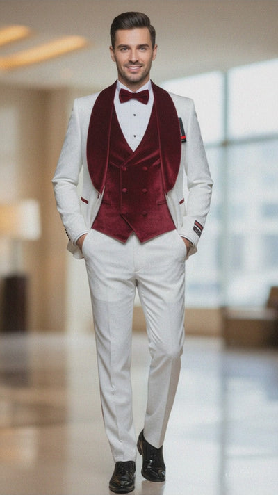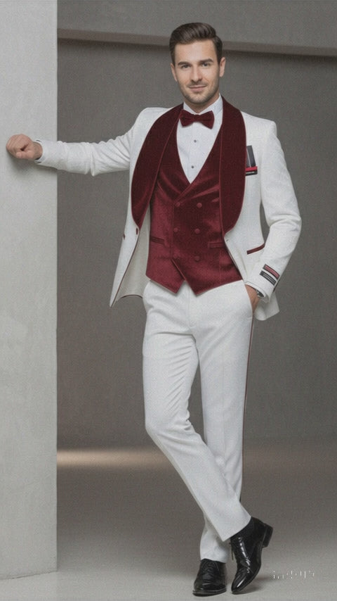 White with Burgundy Velvet Lapel 3-Piece Tailored-Fit Tuxedo