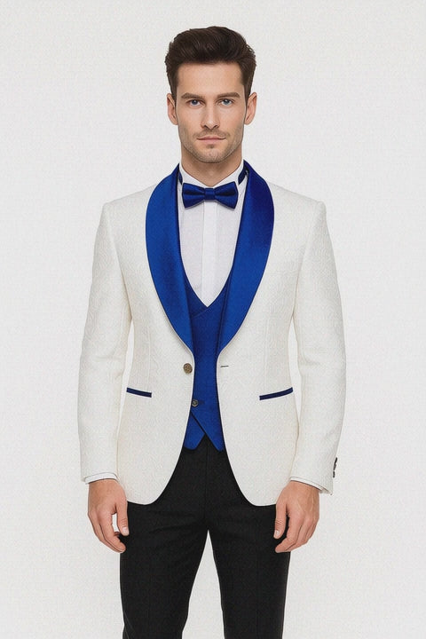 Wide Shawl Lapel Tuxedo - Wedding Groom White & Blue - Vested With Bowtie