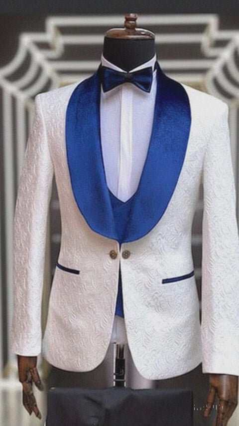 The Wide Shawl Lapel Tuxedo – Wedding Groom White & Blue – Vested with Bowtie is more than just formalwear; it’s a statement of elegance, confidence, and individuality. Designed for men who want to stand out while maintaining timeless sophistication, this tuxedo ensures you’ll look flawless at every step — from walking down the aisle to stepping onto the dance floor.